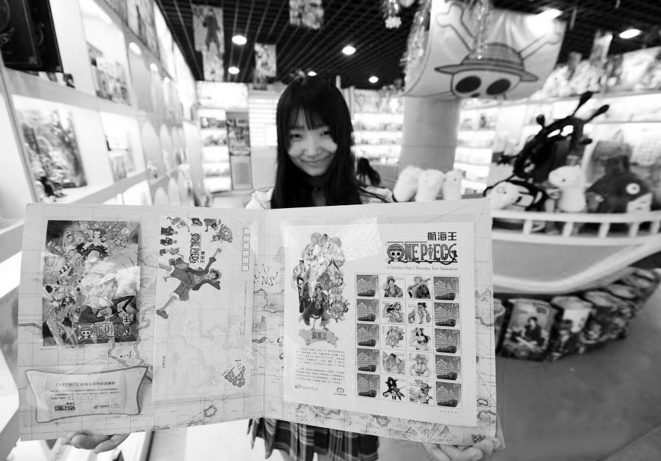 日前,河北石家庄首家动漫邮局内,工作人员正在展示《航海王》纪念邮票和明信片。该动漫邮局是集动漫、卡通、教育数字信息化为一体的富有动漫文化特色的体验式主题邮局。专业定制邮政专属动漫集邮册、邮票、明信片等物品。翟羽佳 摄