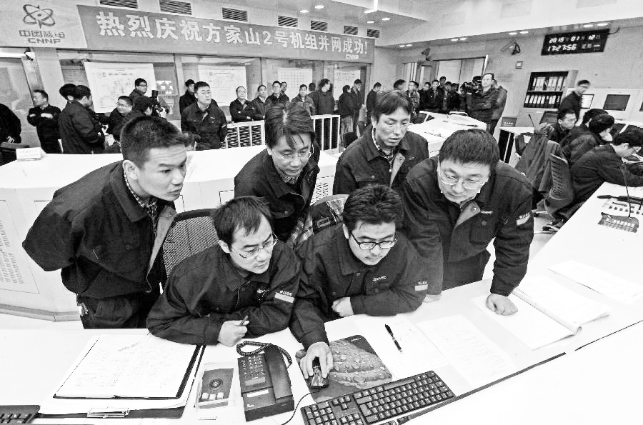 近日,在秦山核电站扩建项目方家山核电工程2号机组主控室,操纵员在监测核电机组运行状况。当日,秦山核电厂扩建项目方家山核电工程2号机组成功并网发电。至此,秦山核电基地现有9台机组全部投产发电,总装机容量达到654.6万千瓦,年发电量约500亿千瓦时,成为目前中国核电机组数量最多、堆型最丰富、装机最大的核电基地。谭进 摄