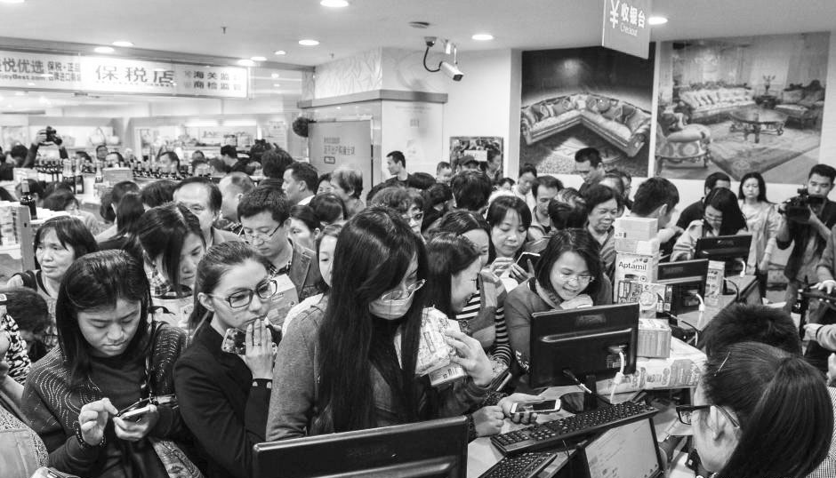 日前,广州首家跨境直购体验店在珠江新城正式试业,收银台前大排长龙。体验店以母婴用品、生活家居、美肤护理、红酒洋酒为主打,商品种类多、小额免征税,消费者凭身份证信息实名购买,现场下单提货。 王卫东 摄