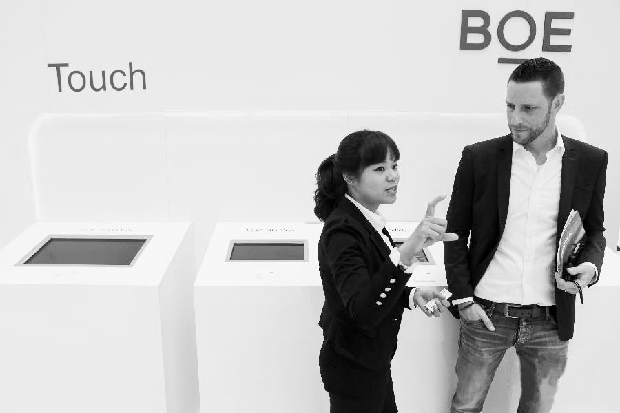 2015年德国汉诺威通信和信息技术博览会(简称汉诺威IT展)近日正式开展,本届展会的主题为“数字经济”。中国作为本届博览会的合作伙伴国,将向世界展示“中国创造”的最新水平。一名参观者在京东方展台聆听工作人员讲解。张帆 摄