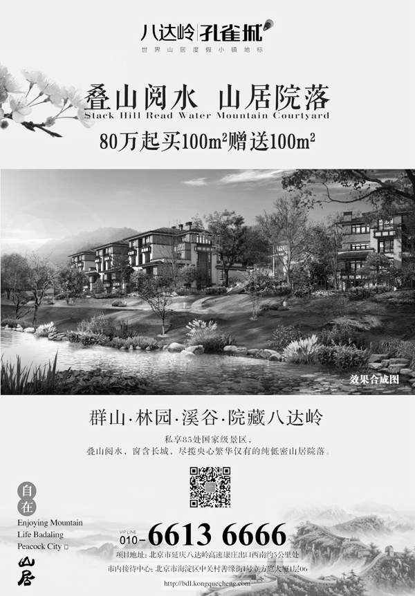 八达岭孔雀城5期山林溪谷,叠山阅水,窗含长城,尽揽央心繁华,仅有的低密山居院落,80万起!臻席待藏,买100平送100平,赠花园、露台、地下室、车位。潺潺小溪,风过松林,周边85处景区环绕,让你足不出户,开启美好度假之旅。
