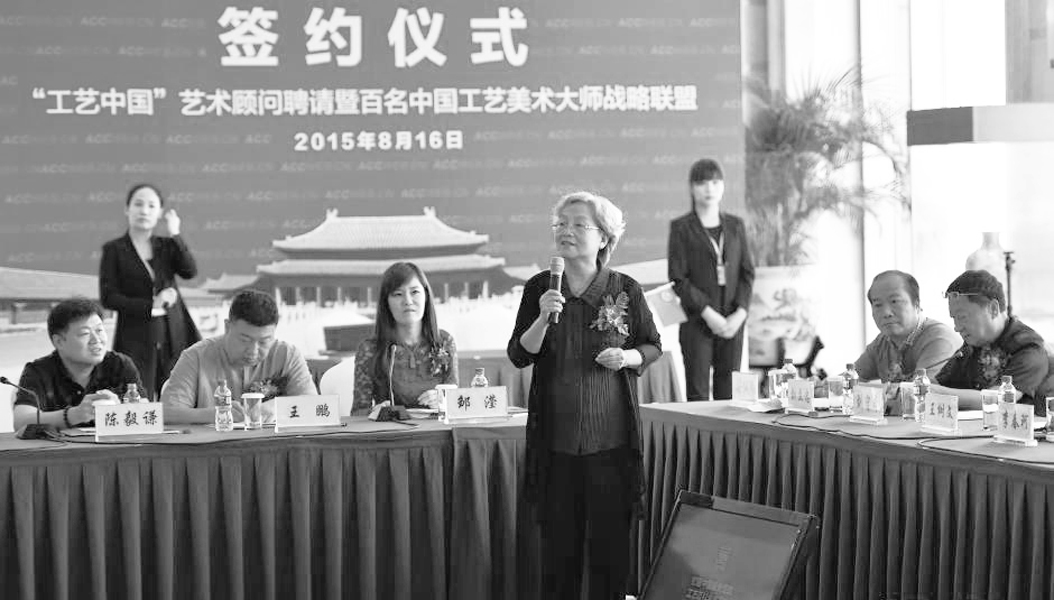 核心摘要:力求打造最全面工艺美术百科全书的 “工艺中国”门户平台,近日在北京举行艺术顾问聘请暨百名中国工艺美术大师签约仪式,显示该平台向“大数据”整合迈出重要一步。“工艺中国”聘请的艺术顾问唐克美在现场介绍各位工艺美术大师。