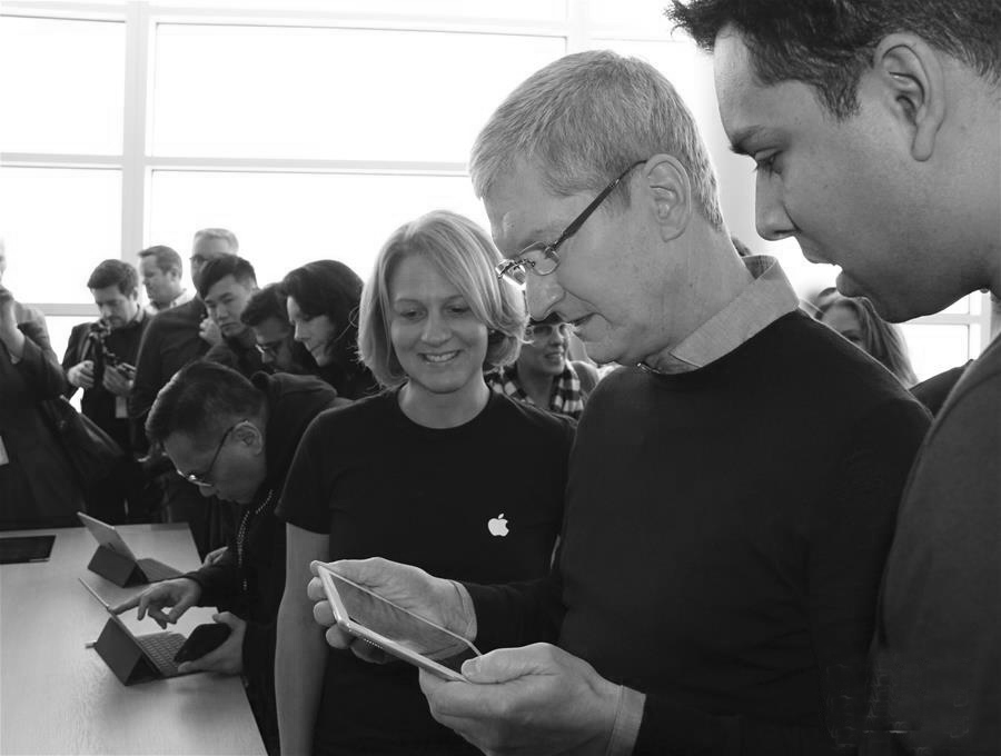 近日,在美国加利福尼亚州丘珀蒂诺,美国苹果公司举行发布会,推介新款智能手机和平板电脑等产品。图为苹果公司首席执行官蒂姆·库克(右二)在发布会上试用新款iPad Pro平板电脑。