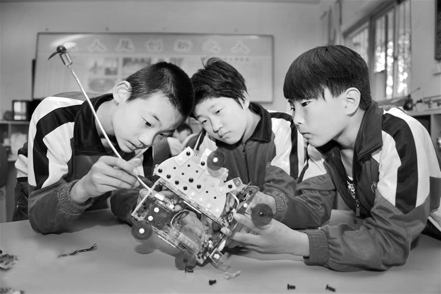 近年来,河北省邢台县相继为16所农村学校配备了机器人创新探究道具、互动移动智慧课堂系统、数字电脑绘画板等现代化教学设备,提升了农村学校教育信息化水平,丰富了农村学生的课堂生活。图为邢台县会宁完小的学生在组装机器人。