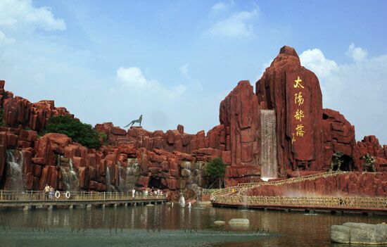 只见,时空隧道、盘古狂叫、女娲补天、共工的愤怒……四十多个史前文明主题项目在这里全新诠释古老的大汶口文化符号;天旋地转、山洪暴发、洪荒探险、超速失重……现代高科技在这里复活了上古文明。