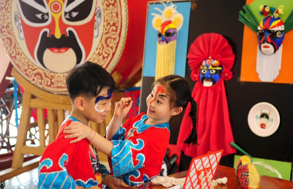 近日,在济南妇女儿童活动中心中华文化体验基地,许多儿童身着汉服画京剧脸谱、诵国学经典、习剪纸。