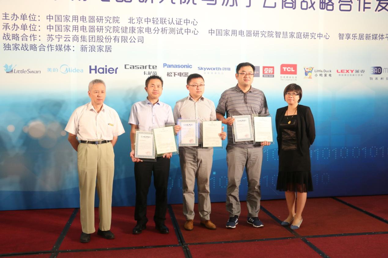 经过5年的发展,A+认证已在洗衣机、洗碗机、电热水器、空气净化器、净水器、电子坐便器、电饭锅等10余种家电品类上得到了应用推广,并获得广泛关注。每年,都会有一批优秀的产品通过严格的A+认证检测,在同类产品中脱颖而出,成为该品类高端产品的标杆,在发布会现场,中轻联、家电院、苏宁云商、新浪家居的领导为今年通过A+认证检测的产品颁发了认证证书及检测报告,并允许获证产品使用“A+”标志。据悉,此次所有获证产品均通过了中国家用电器研究院、中国家用电器研究院健康家电分析测试中心、中国家用电器研究院智慧家庭研究中心 WE.+实验室的专业评测,并且检测结果数据达到了国际先进水平。
