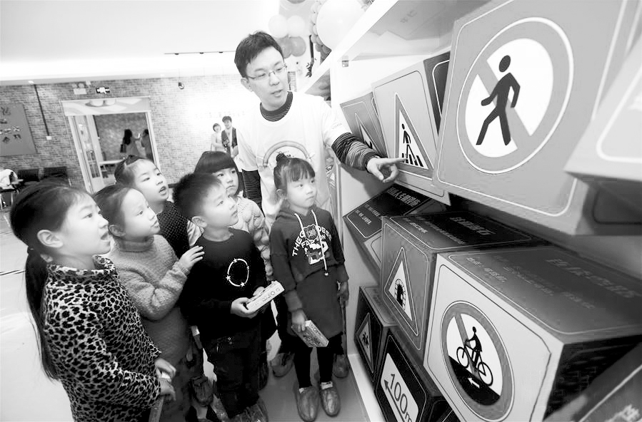 日前,由中国妇女发展基金会、大众汽车集团(中国)共同发起设立的“儿童道路安全体验中心”在天津市河北区正式投入使用。图为天津市河北区兴华小学的学生在讲解员的带领下了解交通安全标识。