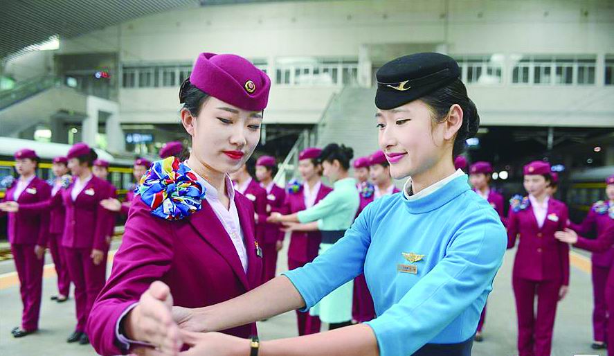 近日,南昌铁路局福州客运段“高姐”与厦门航空福州分公司“空姐”联合开展“展形象促服务,为将要到来的2017年春运做准备。图为厦门航空的“空姐”(中)向南昌铁路局福州客运段“高姐”演示手指操,以缓解服务中的疲劳。