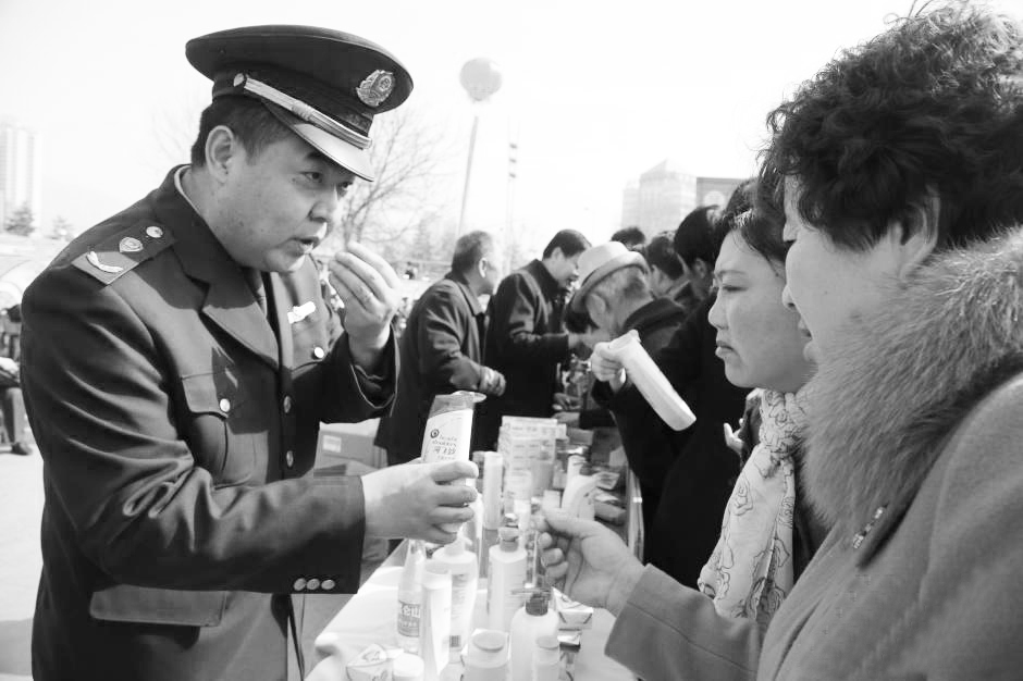 近日,是国际消费者权益日,青海省工商行政管理部门开展了“携手共治、畅想消费”的主题宣传活动。据了解,2014年青海省工商行政管理局12315指挥中心通过各平台,受理答复消费者咨询18752件,受理消费投诉1038件,为消费者挽回经济损失275.38万元(人民币)。青海省各级消费者协会组织受理消费者投诉1024件,为消费者挽回经济损失266万元。工作人员向消费者介绍辨别假冒伪劣洗漱用品的知识。 李俊明 摄