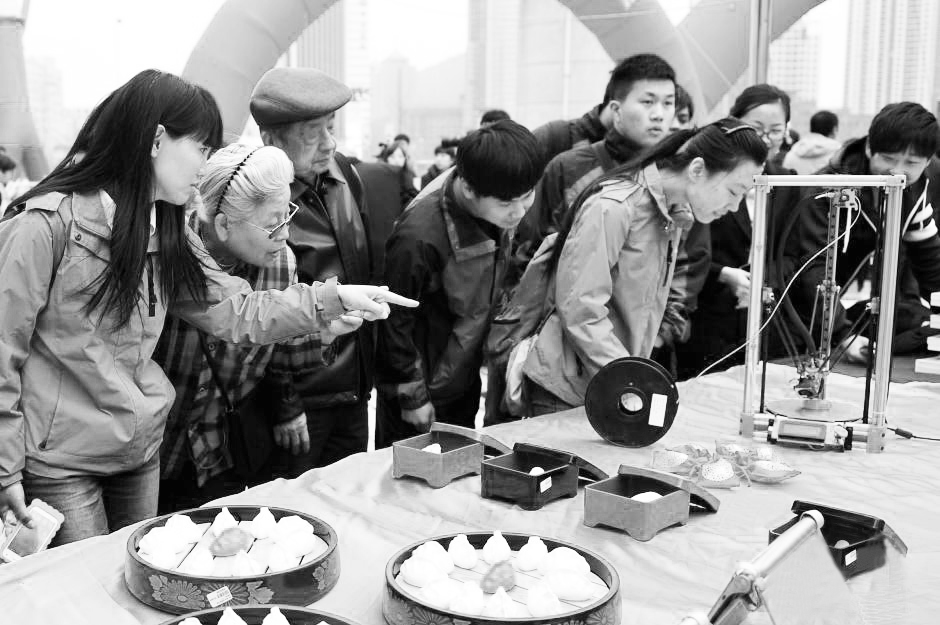 近日,辽宁省第四届全民读书节展销现场,装扮成“精神食粮烹饪者”的工作人员在展示一款通过现场3D打印的御饺形U盘。该U盘内储存有介绍沈阳故宫历史的多媒体电子图书。当天是第20个世界读书日。