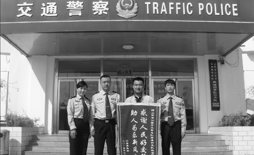 本报讯 (记者 马建平 通讯员 郑勤) 日前,来自汾西县的张磊将一面写有“感谢人民好交警,助人为乐新风尚”的锦旗送到山西高速交警四支队二大队民警手中,感谢民警当日冒雨相助。