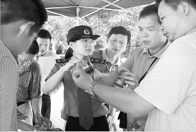 近日,广西壮族自治区靖西县工商局组织党员干部开展“我是党员我争先,服务群众作贡献”党员服务日活动。图为工商执法人员向市民传授辨别商品真伪知识。