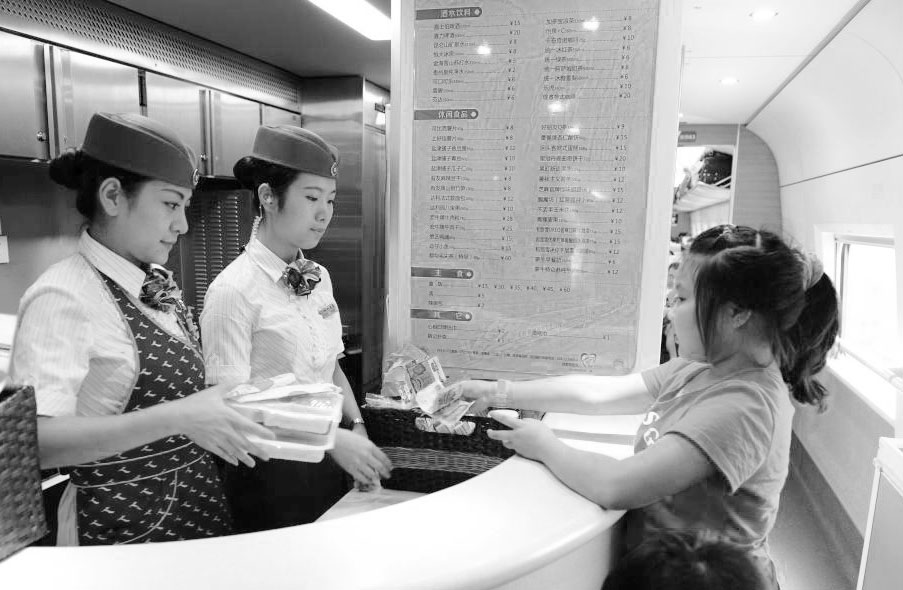 为确保高铁盒饭食品安全卫生,南昌铁路局高铁盒饭供应生产工厂对原材料、设备设施、作业环境、每个菜品都严格依据《CCP(“关键控制点”的简称)参数一览表》进行卫生安全预防控制,确保高铁盒饭的卫生安全。图为在南昌西开往厦门北的高铁上,高姐正在向旅客出售盒饭。本报记者田广杰 摄