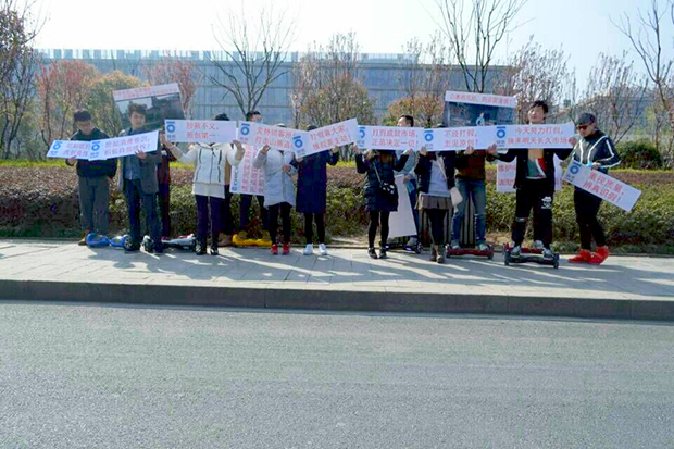 近日,杭州骑客数十名公司员工,骑着公司原创的平衡车,举着标语,穿过大街小巷,举行“骑客315维权杭州行”。图为杭州骑客维权队伍在阿里巴巴杭州总部所在地,呼吁阿里巴巴“支持骑客原创,打击山寨盗版”。