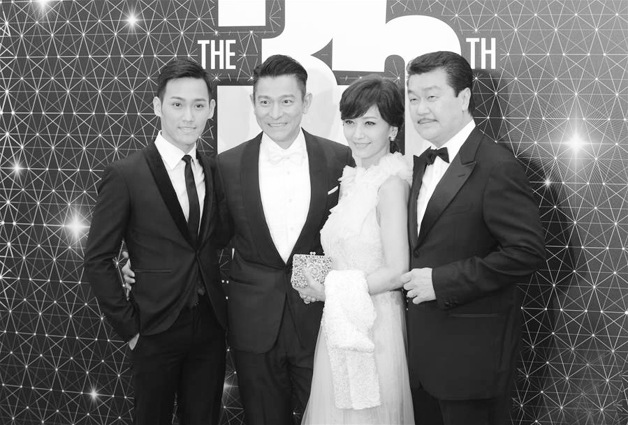 日前,第35届香港电影金像奖颁奖典礼在香港文化中心举行。图为香港演员赵雅芝(右二)一家与刘德华(左二)在金像奖红毯上合影。
