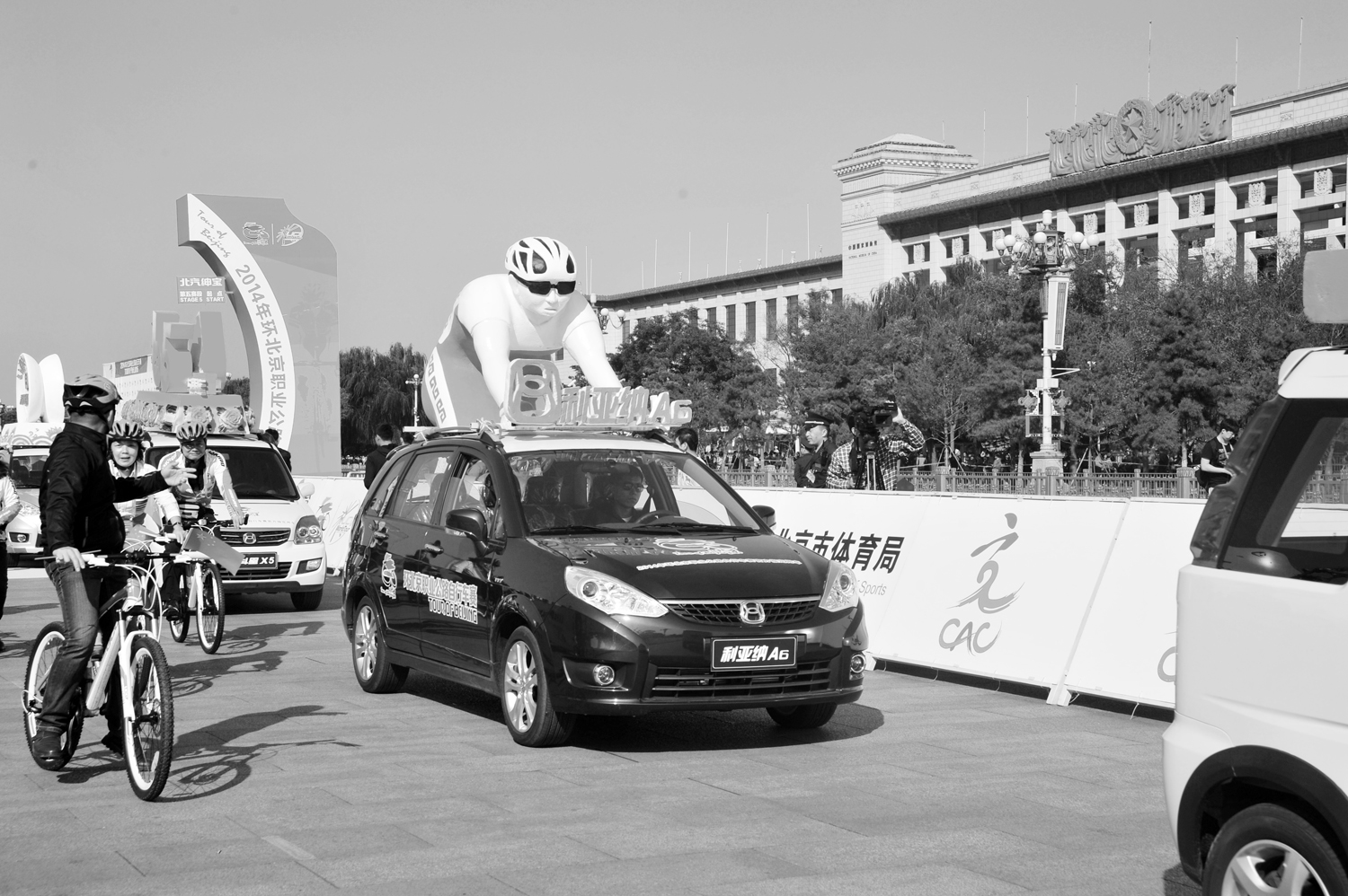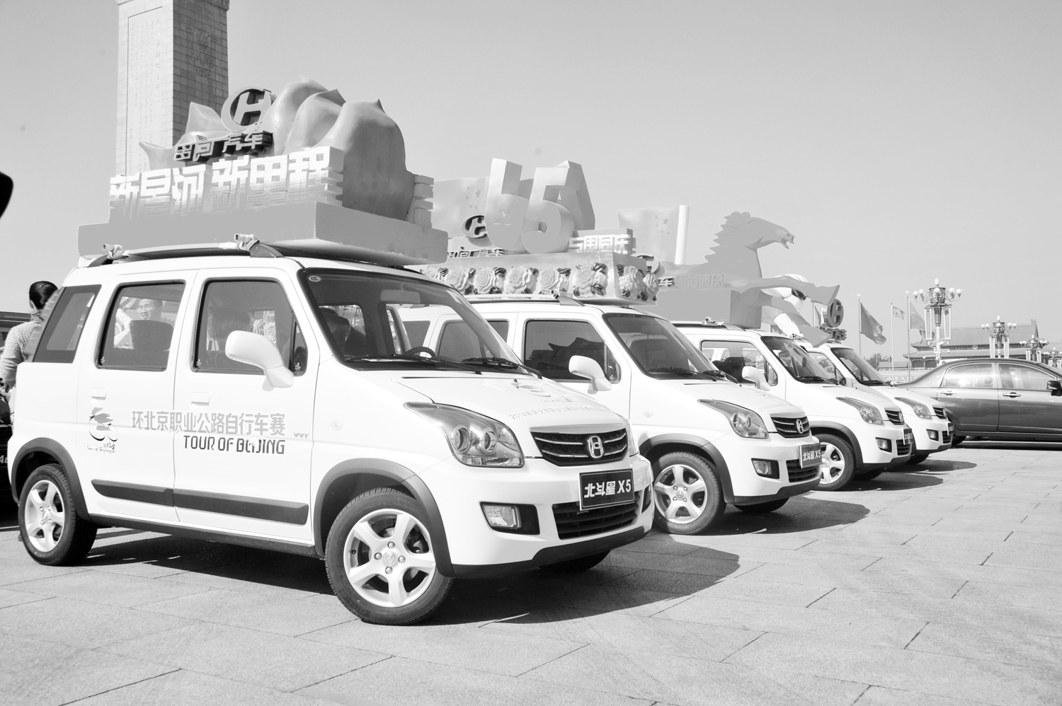 近日,2014环北京职业公路自行车赛(简称环京赛)天安门至鸟巢赛段正式开赛。作为活动赞助商之一的昌河汽车,派出了由14辆北斗星X5和利亚纳A6组成的花车、展车豪华阵容,在天安门广场接受来自全世界参赛选手和观众的“检阅”,成为现场的一大亮点。