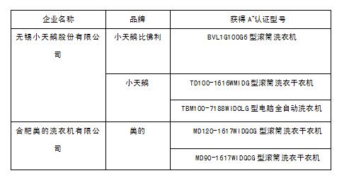 附1:2016年洗衣机、洗衣干衣机A+认证获证产品(排名不分先后)