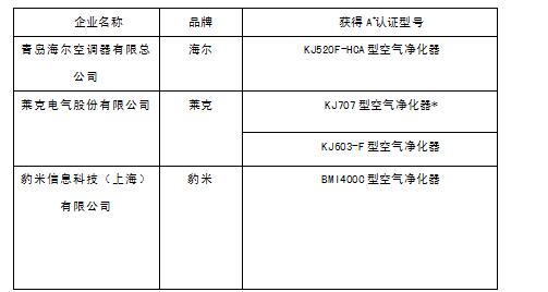 附3:2016年空气净化器A+认证获证产品(排名不分先后)