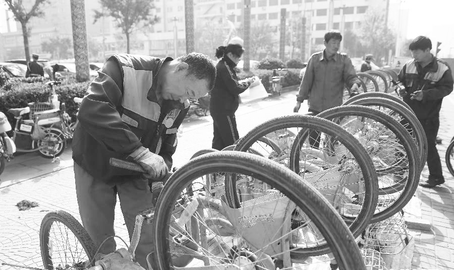 太原工作人员为保障冬季公共自行车正常运行进行维护